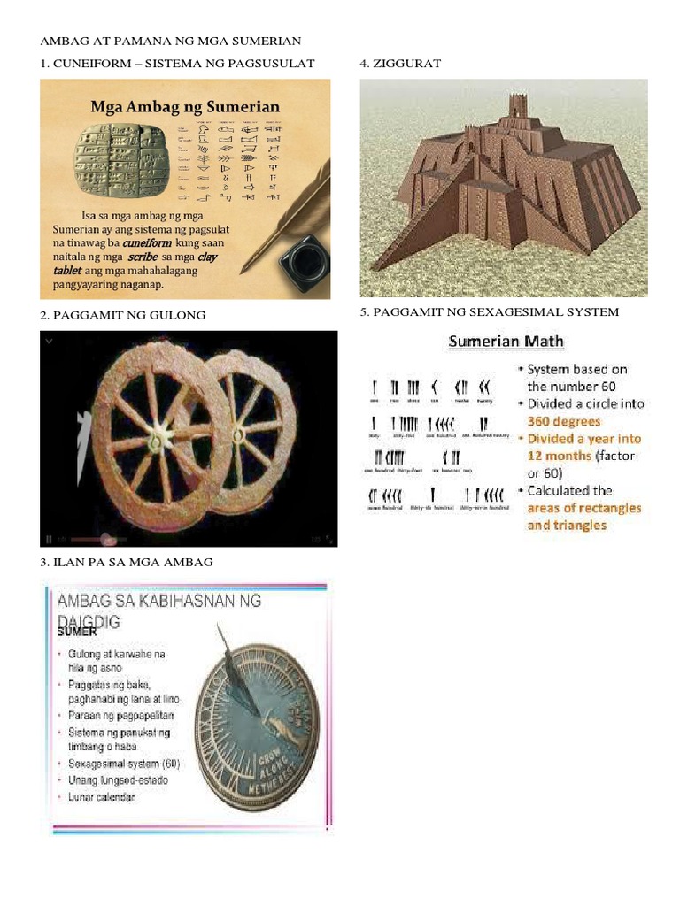 Sa panimulang aralin na ito ay mauunawaan mo ang. Sistema ng Sexagesimal ang panukat ng timbang at haba ng sumer. AMBAG SA KABIHASNAN NG DAIGDIG SUMER Gulong at karwahe na hila ng asno Paggatas ng bakat paghahabi ng lana at lino Paraan ng pagpapalitan Sistema ng panukat ng timbang o haba Sexagesimal system 60 Unang lungsod-estado Lunar calendar Cuneiform Clay tablet Dome at vault sa arkitektura at inhenyeriya.